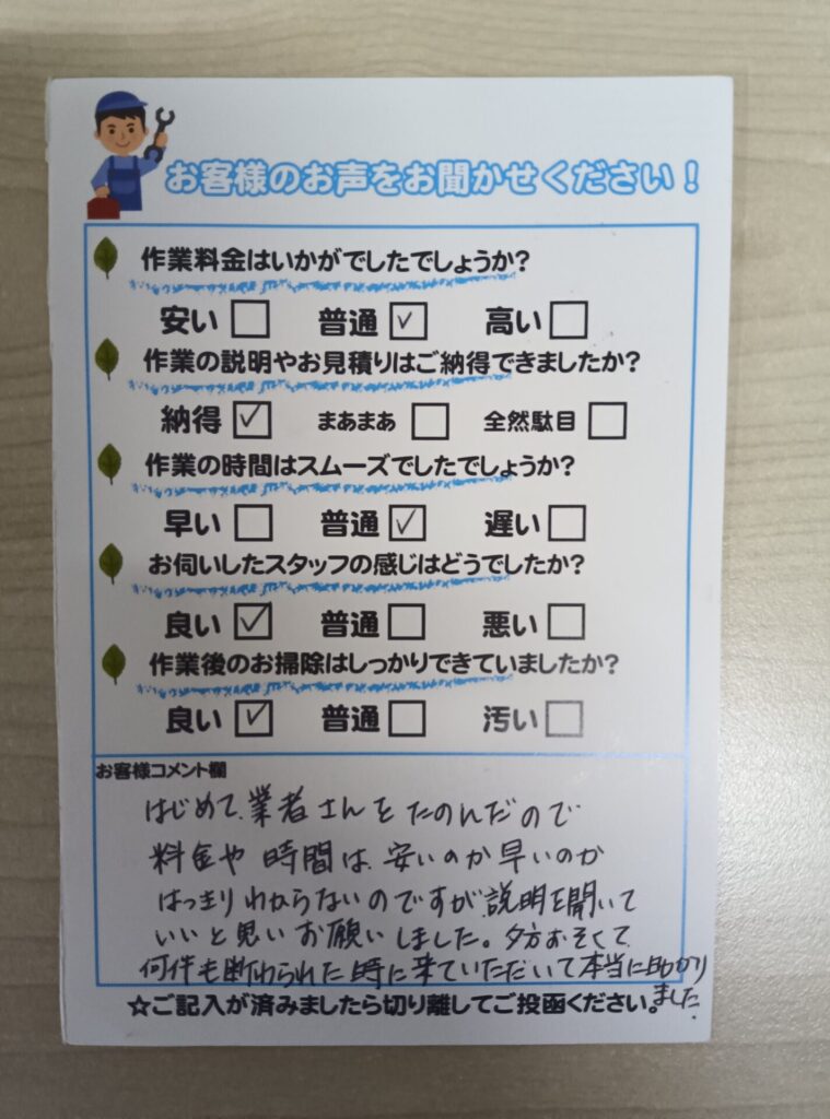 はじめて業者へご依頼されたとの事で、不安もあったかと思いますが、説明を聞いてご納得いただけたとのお言葉をいただき安心いたしました。